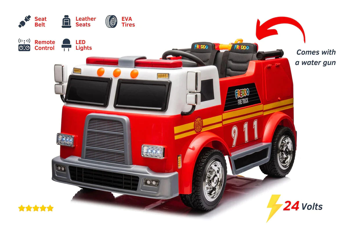 Ignite your child's imagination with the FREDDO Fire Truck! Designed for young heroes aged 3-8, this powerful 24V ride-on ensures extended playtime. Featuring luxurious leather seats, bright LED lights, and cushiony EVA tires for smooth rides. Your child will love the included water gun and working hand mic for added adventure! Parents can steer the excitement safely with the remote parental control. Every mission becomes a heroic tale!