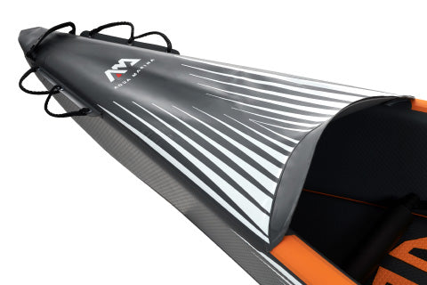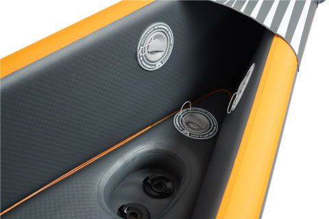 This kayak is a performance machine for true adventurers. The brand-new TOMAHAWK AIR-K is fully constructed with Drop Stitch Technology featuring a stunning look and incredible quality. Blending efficiency, speed, comfort and stability, it offers all you need for perfect cruising with a light load. It’s a lean speed-air-watercraft with streamlined floor, molded V-shaped form under bow and stern providing remarkable tracking performance yet enabling paddlers to make quick and stable turns.