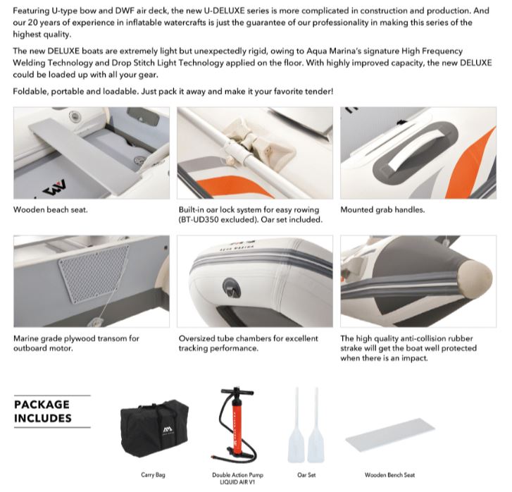 The new DELUXE boats are extremely light but unexpectedly rigid, owing to Aqua Marina’s signature High Frequency Welding Technology and Drop Stitch Light Technology applied on the floor.