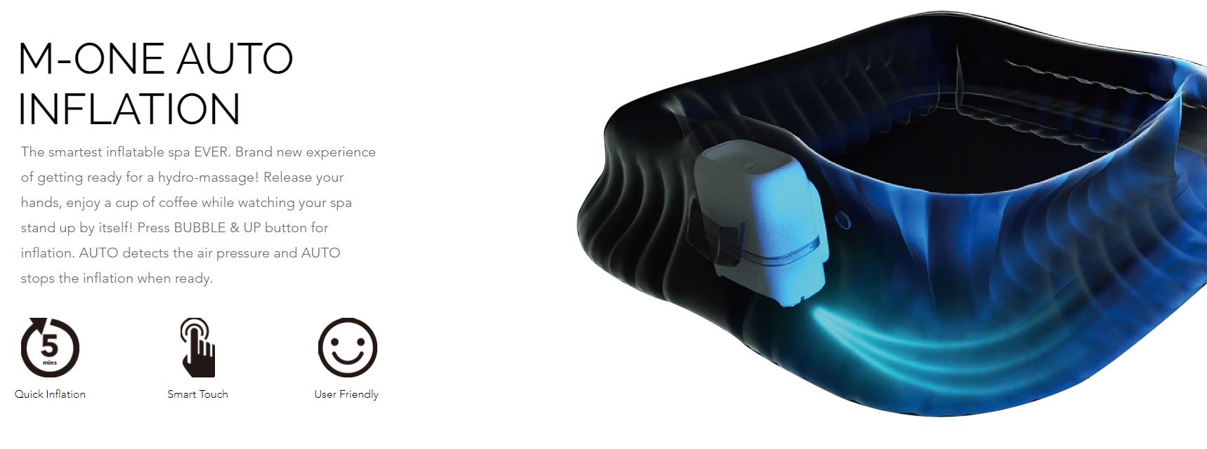 •PATENTED PLUG AND PLAY TECHNOLOGY: No time-consuming installation. Simply remove the spa from its box, plug in, rotate the knob, long press the button “ ”, and watch your spa to be inflated in minutes!