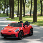 Ignite your child's imagination with the officially licensed Freddo Toys 24V Porsche 911 GT3 2-Seater Ride-On Car. Designed for young enthusiasts aged 6 and up, this stunning red ride-on replicates the iconic sports car with incredible detail. It offers a realistic driving experience with a pedal brake, button start, and an integrated music system with USB, radio, and Bluetooth connectivity for endless entertainment. The durable EVA tires ensure a smooth ride, while bright LED lights add to the authenticity and fun. With its comfortable leather seats and safety seatbelts, your child can enjoy hours of secure playtime, reaching speeds powered by 2 180-320W SILENT MOTOR. The remote control allows parents to supervise and assist, making it the perfect gift for aspiring drivers.