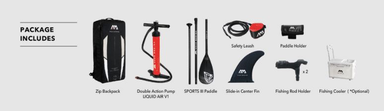 Includes: Double Action Pump, Zip Backpack, Sports III Paddle, Safety Leash, Slide-in Center Fin, Paddle Holder, Fishing Rod Holder x2,