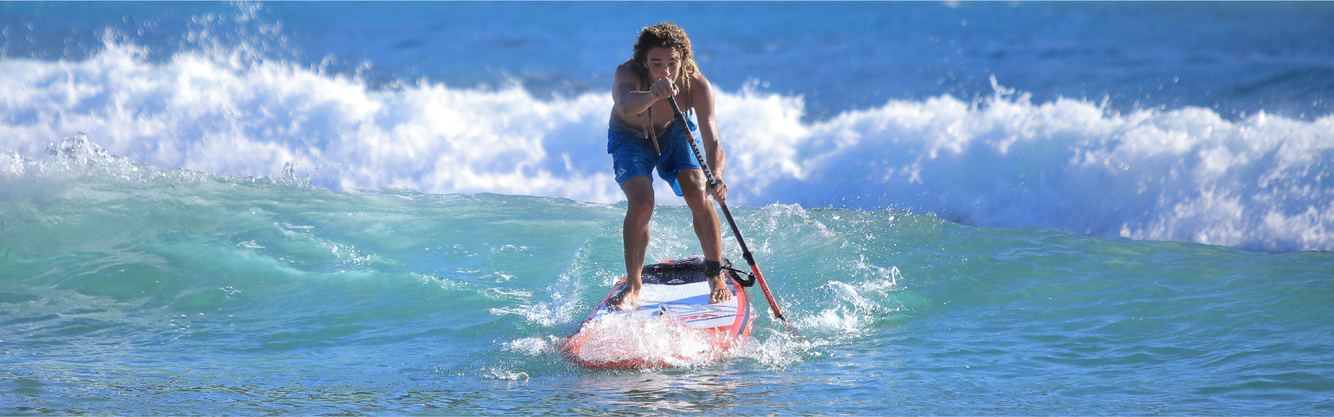 The 8’8’’ WAVE with a rounded and wide nose helps to easily get the board through waves for any level of rider. The narrow tail with a removable fin gives super-fast responsiveness with extra hold for tight turns. Produced in Double Layer Technology with 1000D extra rail-band reinforcement, the WAVE can be inflated up to 18psi which provides incredible stiffness and reactiveness. The deep diamond grooved deck pad offers comfort and grip and a diamond cut kick pad provides greater grip and stability. Now you can catch a wave whenever you want.