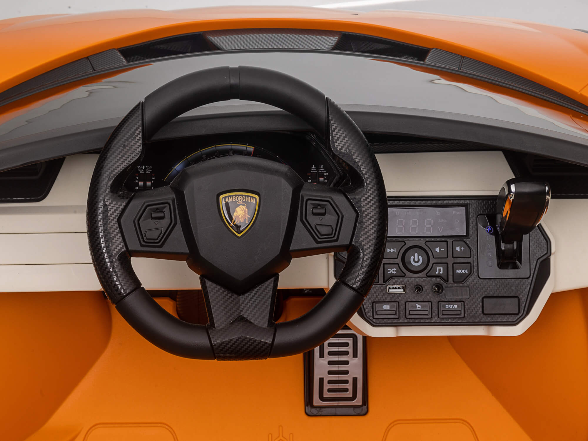 Seated in dual eco-leather seats, young drivers interact with an intuitive dashboard layout and realistic controls, including a push-button start and functional steering wheel with power assist. The experience becomes even more engaging with a Bluetooth-enabled sound system, USB music input, and authentic engine sounds, allowing kids to enjoy their favorite music while driving.